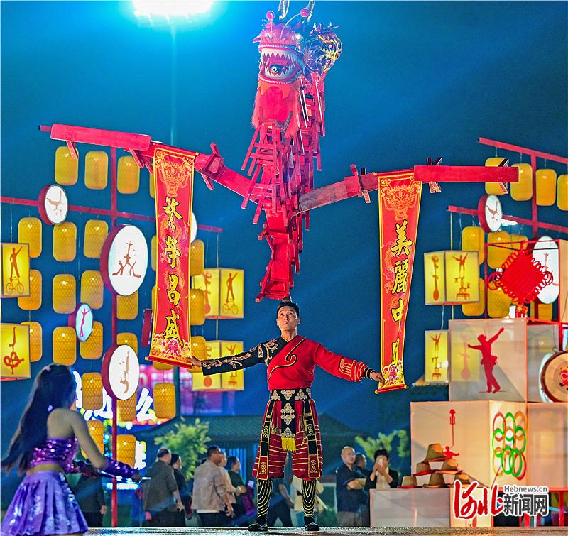 10月2日晚,吴桥杂技博物馆外,热闹的杂技巡游精彩上演。